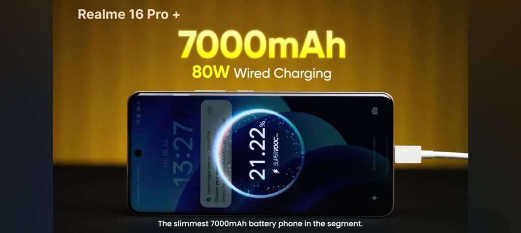 मुख्य बिंदु: Realme 16 Pro+ में एक विशाल 7000mAh की ‘Titan’ बैटरी दी गई है। इतनी बड़ी बैटरी के बावजूद फोन की मोटाई सिर्फ 8.49mm है, जो इंजीनियरिंग का एक चमत्कार है।